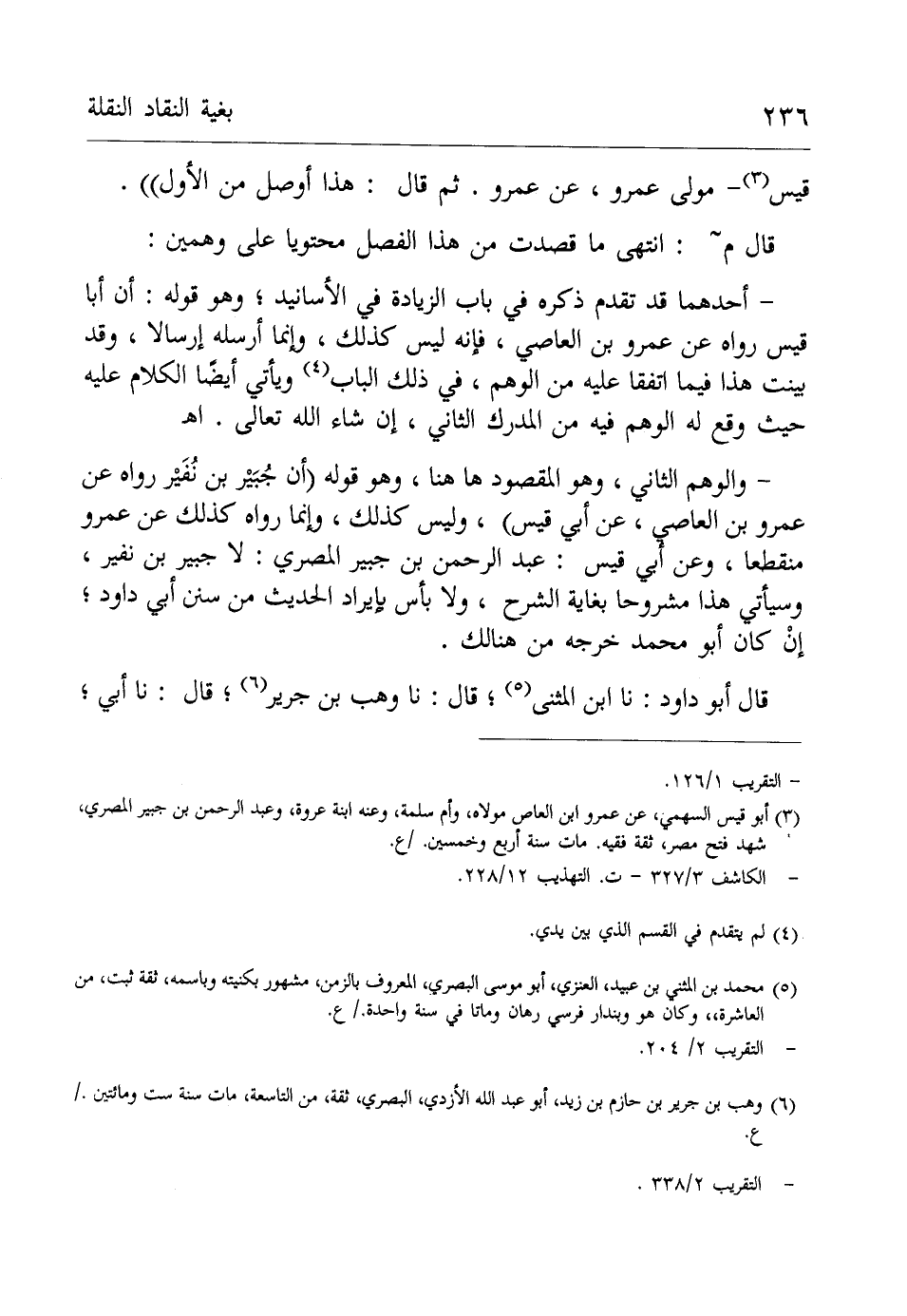 - والوهم الثاني، وهو المقصود ها هنا، وهو قوله (أن جُبَير بن نُفَيْر رواه عن عمرو بن العاصي، عن أبي قيس)، وليس كذلك، وإنما رواه كذلك عن عمرو منقطعا، وعن أبي قيس: عبد الرحمن بن جبير المصري: لا جبير بن نفير، وسيأتي هذا مشروحا بغاية الشرح، ولا بأس بإيراد الحديث من سنن أبي داود؛ إن كان أبو محمد خرجه من هنالك.