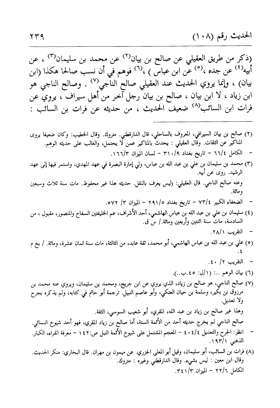 (ذكر من طريق العقيلي عن صالح بن بيان (¬2) عن محمد بن سليمان (¬3)، عن أبيه (¬4) عن جده، (¬5) عن ابن عباس)، (¬6) فوهم في أن نسب صالحا هكذا (ابن بيان)، وإنما يروي الحديث عند العقيلي صالح الناجي (¬7). وصالح الناجي هو ابن زياد، لا ابن بيان، صالح بن بيان رجل آخر من أهل سيراف، يروي عن فرات ابن السائب (¬8) ضعيف الحديث، من حديثه عن فرات بن السائب: