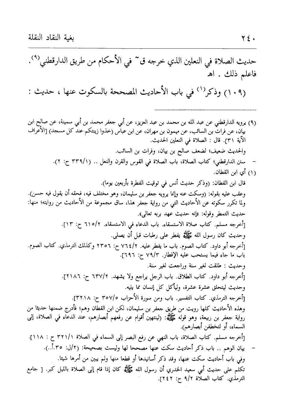 (¬9) يرويه الدارقطني عن عبد الله بن محمد بن عبد العزيز، عن أبي جعفر محمد بن أبي سمينة، عن صالح ابن بيان، عن فرات بن السائب، عن ميمون بن مهران، عن ابن عباس (خذوا رينتكم عند كل مسجد) [الأعراف الآية 31]. قال: الصلاة في النعلين الحديث.