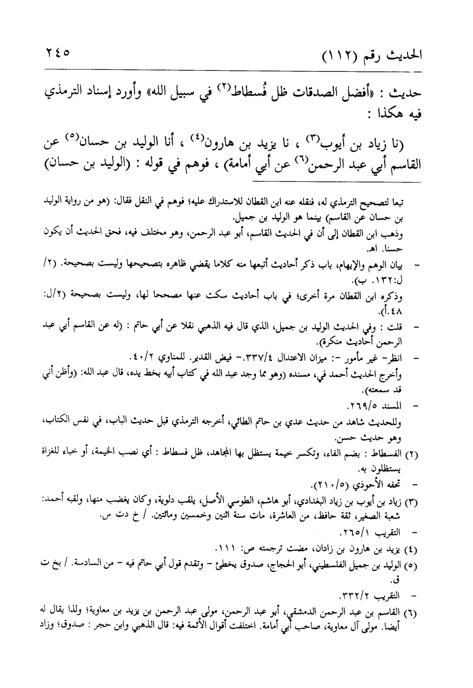 حديث: "أفضل الصدقات ظل فُسطاط (¬2) في سبيل الله" وأورد إسناد الترمذي فيه هكذا: