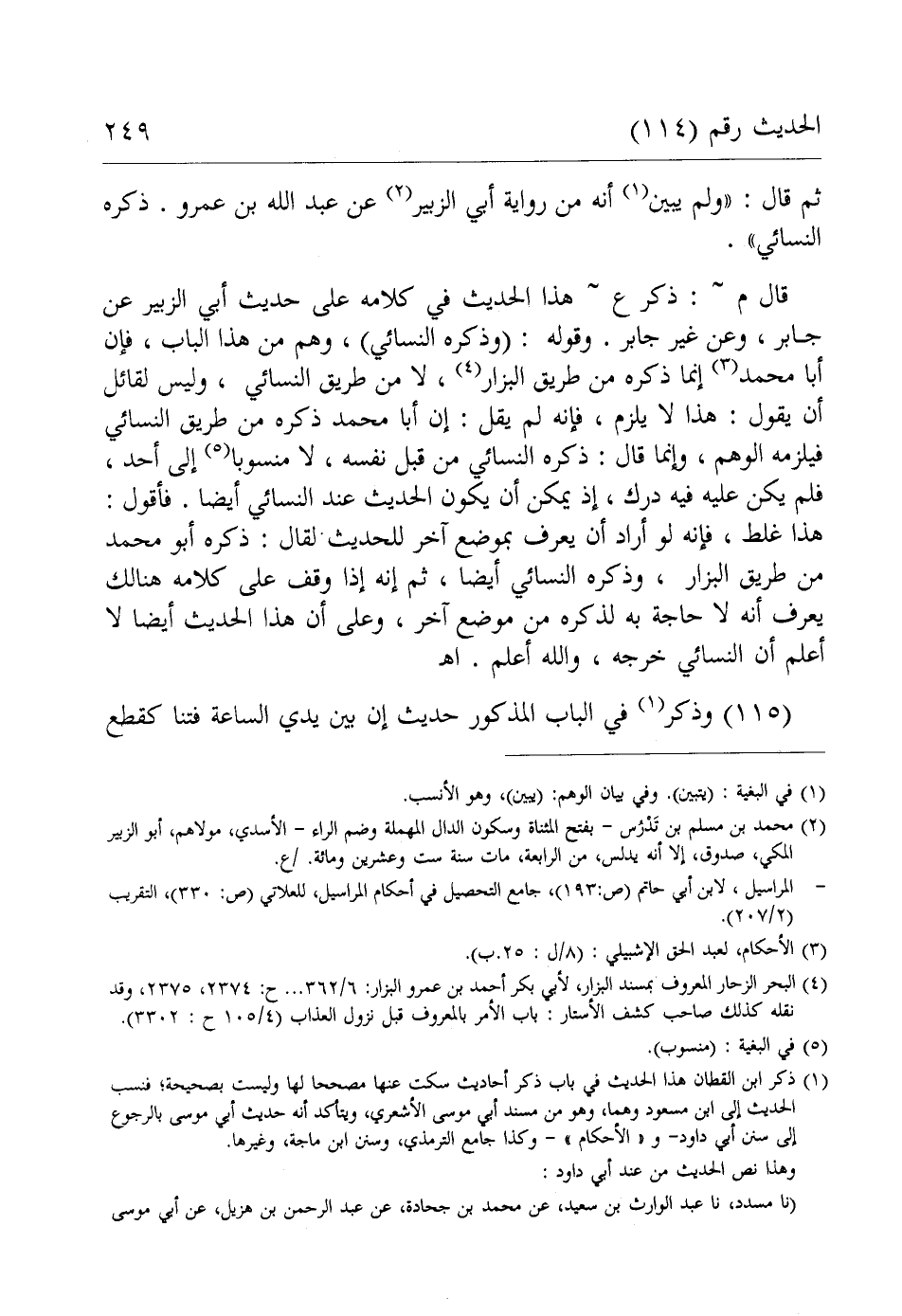 قال م: ذكر ع هذا الحديث في كلامه على حديث أبي الزبير عن جابر، وعن غير جابر. وقوله: (وذكره النسائي)، وهم من هذا الباب، فإن أبا محمد (¬3) إنما ذكره من طريق البزار (¬4)، لا من طريق النسائي، وليس لقائل أن يقول: هذا لا يلزم، فإنه لم يقل: إن أبا محمد ذكره من طريق النسائي فيلزمه الوهم، وإنما قال: ذكره النسائي من قبل نفسه، لا منسوبا (¬5) إلى أحد، فلم يكن عليه فيه درك، إذ يمكن أن يكون الحديث عند النسائي أيضا. فأقول: هذا غلط، فإنه لو أراد أن يعرف بموضع آخر للحديث لقال: ذكره أبو محمد من طريق البزار، وذكره النسائي أيضا، ثم إنه إذا وقف على كلامه هنالك يعرف أنه لا حاجة به لذكره من موضع آخر، وعلى أن هذا الحديث أيضا لا أعلم أن النسائي خرجه، والله أعلم. اهـ