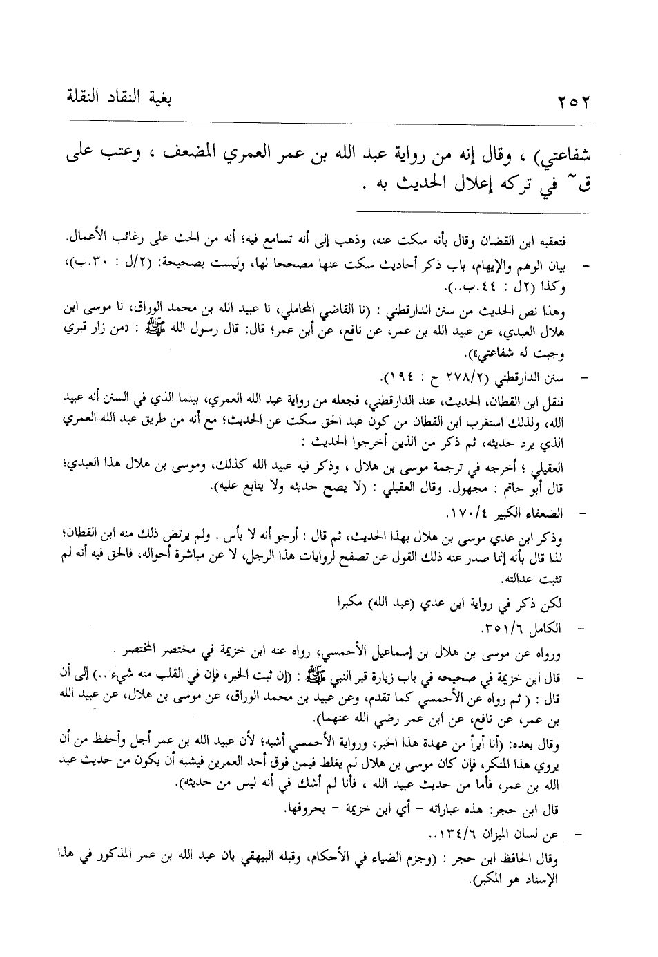 شفاعتي)، وقال إنه من رواية عبد الله بن عمر العمري الضعف، وعتب على ق في تركه إعلال الحديث به.