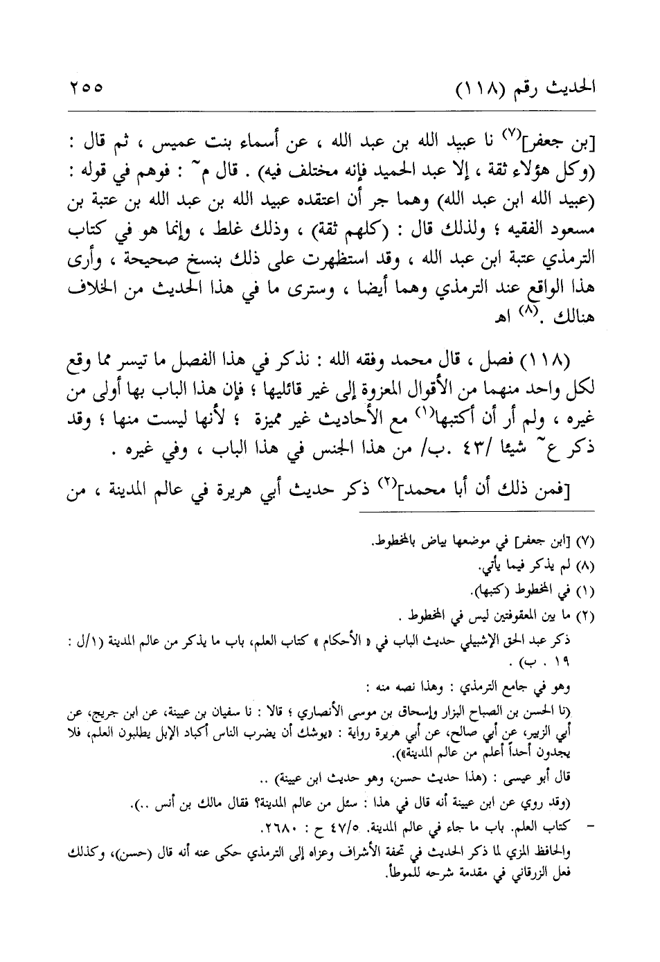 [بن جعفر] (¬7) نا عبيد الله بن عبد الله، عن أسماء بنت عميس، ثم قال: (وكل هؤلاء ثقة، إلا عبد الحميد فإنه مختلف فيه). قال م: فوهم في قوله: (عبيد الله ابن عبد الله) وهما جر أن اعتقده عبيد الله بن عبد الله بن عتبة بن مسعود الفقيه؛ ولذلك قال: (كلهم ثقة)، وذلك غلط، وإنما هو في كتاب الترمذي عتبة ابن عبد الله، وقد استظهرت على ذلك بنسخ صحيحة، وأرى هذا الواقع عند الترمذي وهما أيضا، وسترى ما في هذا الحديث من الخلاف هنالك. (¬8) اهـ