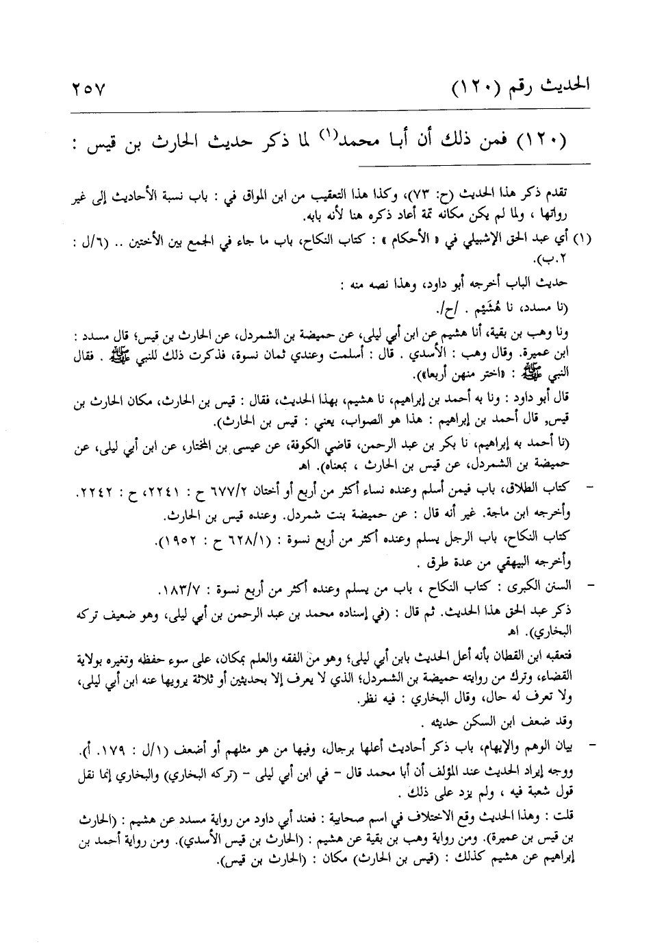 قلت: وهذا الحديث وقع الاختلاف في اسم صحابية: فعند أبي داود من رواية مسدد عن هشيم: (الحارث بن قيس بن عميرة). ومن رواية وهب بن بقية عن هشيم: (الحارث بن قيس الأسدي). ومن رواية أحمد بن إبراهيم عن هشيم كذلك: (قيس بن الحارث) مكان: (الحارث بن قيس).