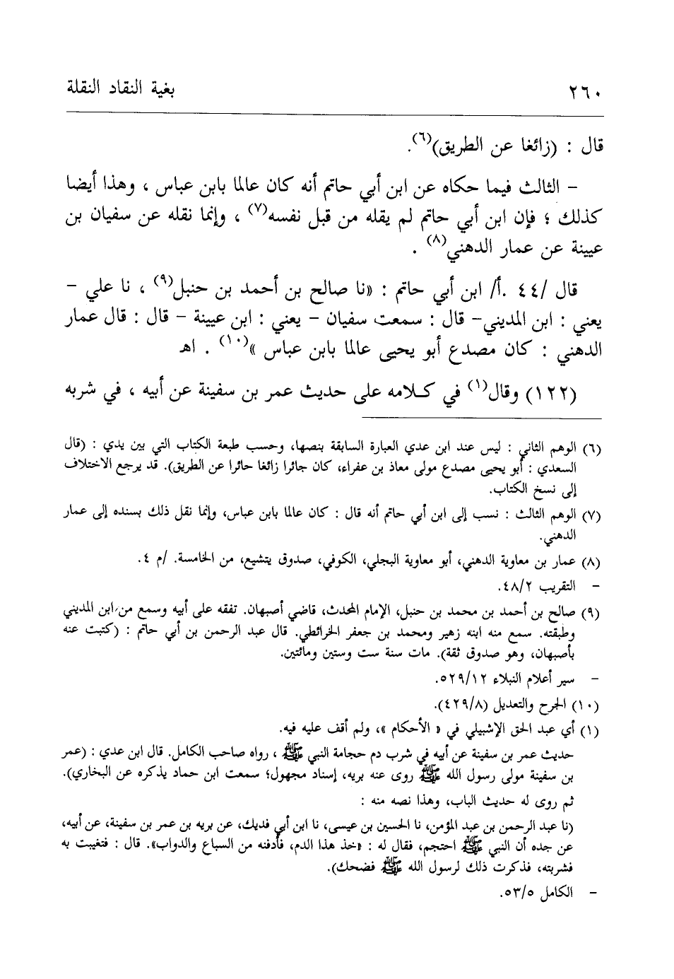 - الثالث فيما حكاه عن ابن أبي حاتم أنه كان عالما بابن عباس، وهذا أيضا كذلك؛ فإن ابن أبي حاتم لم يقله من قبل نفسه (¬7)، وإنما نقله عن سفيان بن عيينة عن عمار الدهني (¬8).