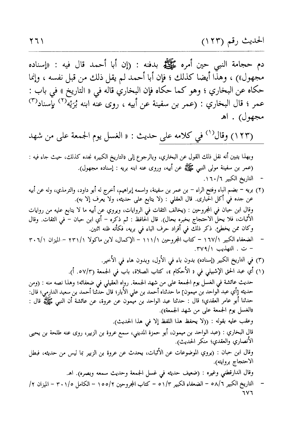 دم حجامة النبي حين أمره - صلى الله عليه وسلم - بدفنه: (إن أبا أحمد قال فيه: "إسناده مجهول")، وهذا أيضا كذلك، فإن أبا أحمد لم يقل ذلك من قبل نفسه، وإنما حكاه عن البخاري، وهو كما حكاه فإن البخاري قاله في "التاريخ" في باب: عمر، قال البخاري: (عمر بن سفينة عن أبيه، روى عنه ابنه بُرَيْه (¬2) بإسناد (¬3) مجهول). اهـ