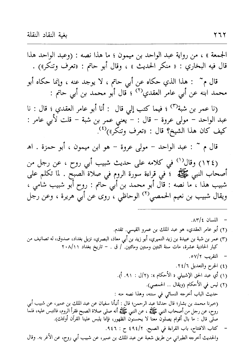 (124) وقال (¬1) في كلامه على حديث شبيب أبي روح، عن رجل من أصحاب النبي - صلى الله عليه وسلم -، في قراءة سورة الروم في صلاة الصبح. لما تكلم على شبيب هذا، ما نصه: قال أبو محمد بن أبي حاتم: روح أبو شبيب شامي، ويقال شبيب بن نعيم الحمصي (¬2) الوحاظي، روى عن أبي هريرة، وعن رجل