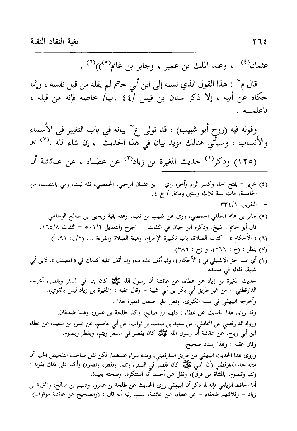 حديث المغيرة بن زياد عن عطاء، عن عائشة أن رسول الله - صلى الله عليه وسلم - كان يتم في السفر ويقصر، أخرجه الدارقطني -من غير طريق أبي بكر بن أبي شيبة- وقال عقبه: (المغيرة بن زياد ليس بالقوي).