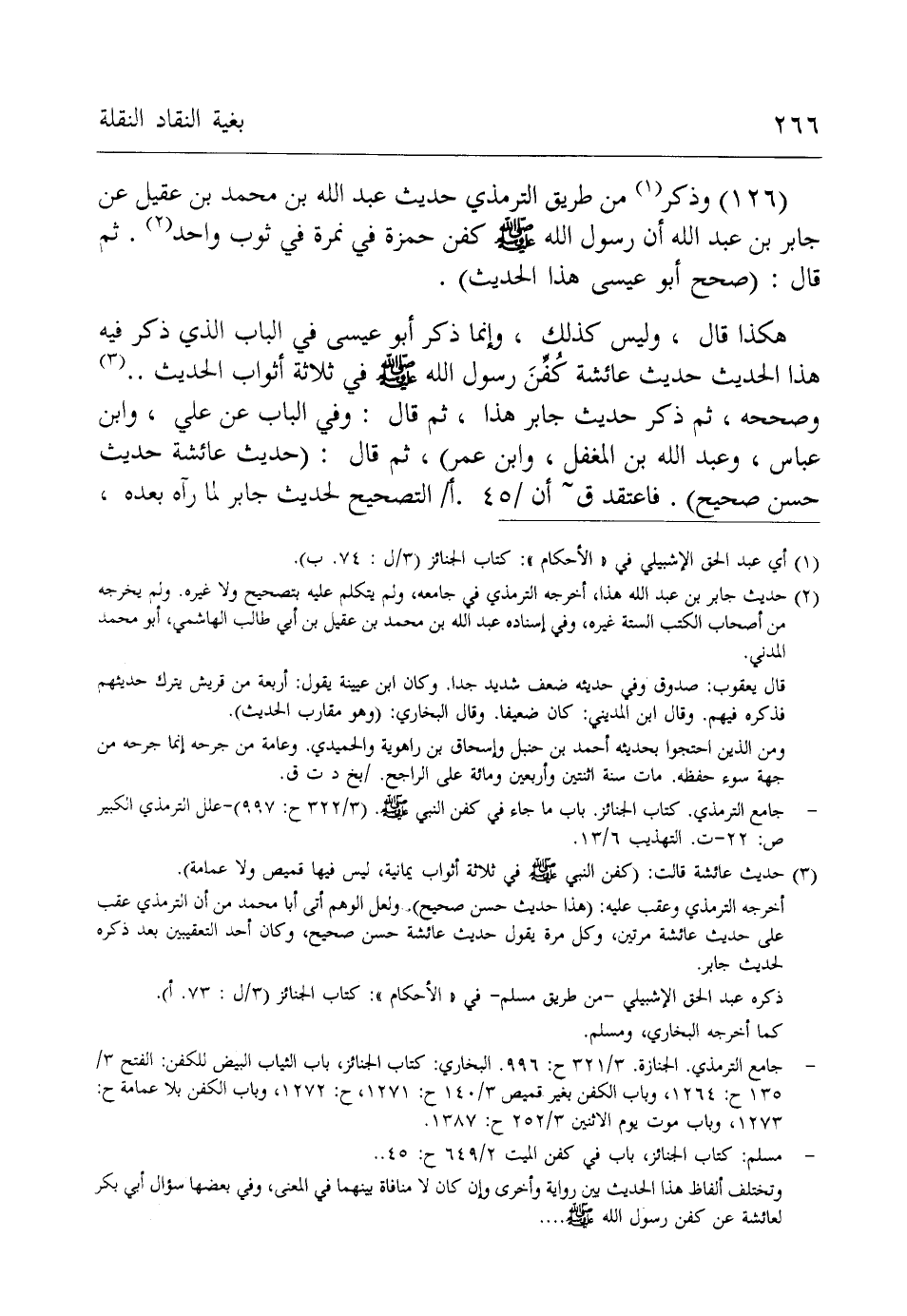 (126) وذكر (¬1) من طريق الترمذي حديث عبد الله بن محمد بن عقيل عن جابر بن عبد الله أن رسول الله - صلى الله عليه وسلم - كفن حمزة في نمرة في ثوب واحد (¬2). ثم قال: (صحح أبو عيسى هذا الحديث).