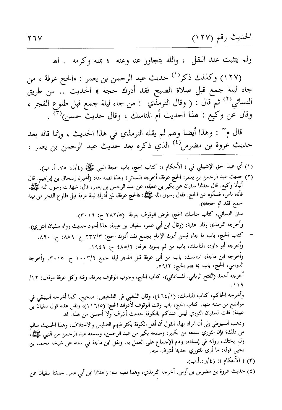 (127) وكذلك ذكر (¬1) حديث عبد الرحمن بن يعمر: "الحج عرفة، من جاء ليلة جمع قبل صلاة الصبح فقد أدرك حجه" الحديث .. من طريق النسائي (¬2) ثم قال: (وقال الترمذي: من جاء ليلة جمع قبل طلوع الفجر، وقال عن وكيع: هذا الحديث أم المناسك، وقال حديث حسن) (¬3).
