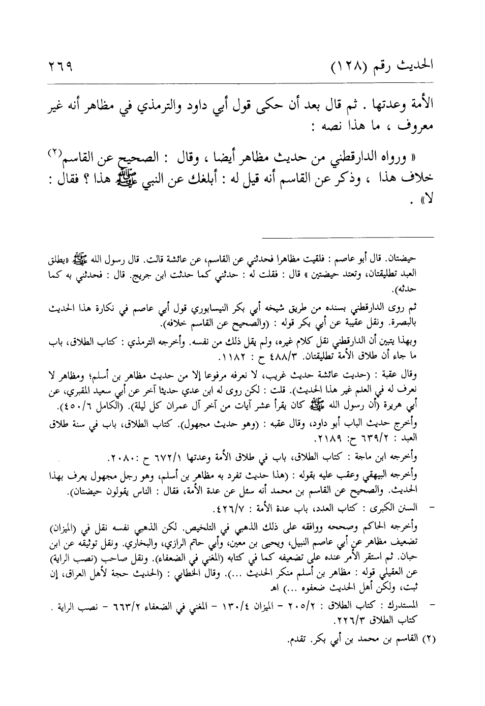 وأخرجه البيهقي وعقب عليه بقوله: (هذا حديث تفرد به مظاهر بن أسلم، وهو رجل مجهول يعرف بهذا الحديث. والصحيح عن القاسم بن محمد أنه سئل عن عدة الأمة, فقال: الناس يقولون حيضتان).