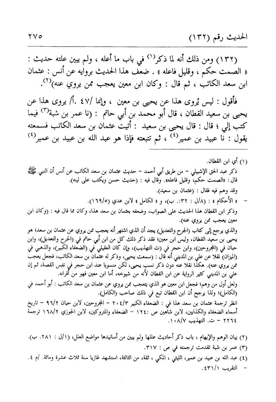 (132) ومن ذلك أنه لما ذكر (¬1) في باب ما أعله، ولم يبين علته حديث: "الصمت حكم، وقليل فاعله". ضعف هذا الحديث بروايه عن أنس: عثمان ابن سعد الكاتب، ثم قال: وكان ابن معين يعجب ممن يروي عنه) (¬2).