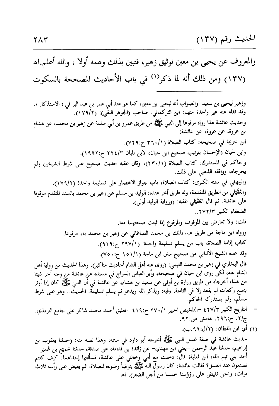 وزهير ليحيى بن سعيد. والصواب أنه ليحيى بن معين، كما هو عند أبي عمر بن عبد البر في "الإستذكار". وقد نقله عنه غير واحد؛ منهم: ابن التركماني. صاحب (الجوهر النقي): (2/ 179).