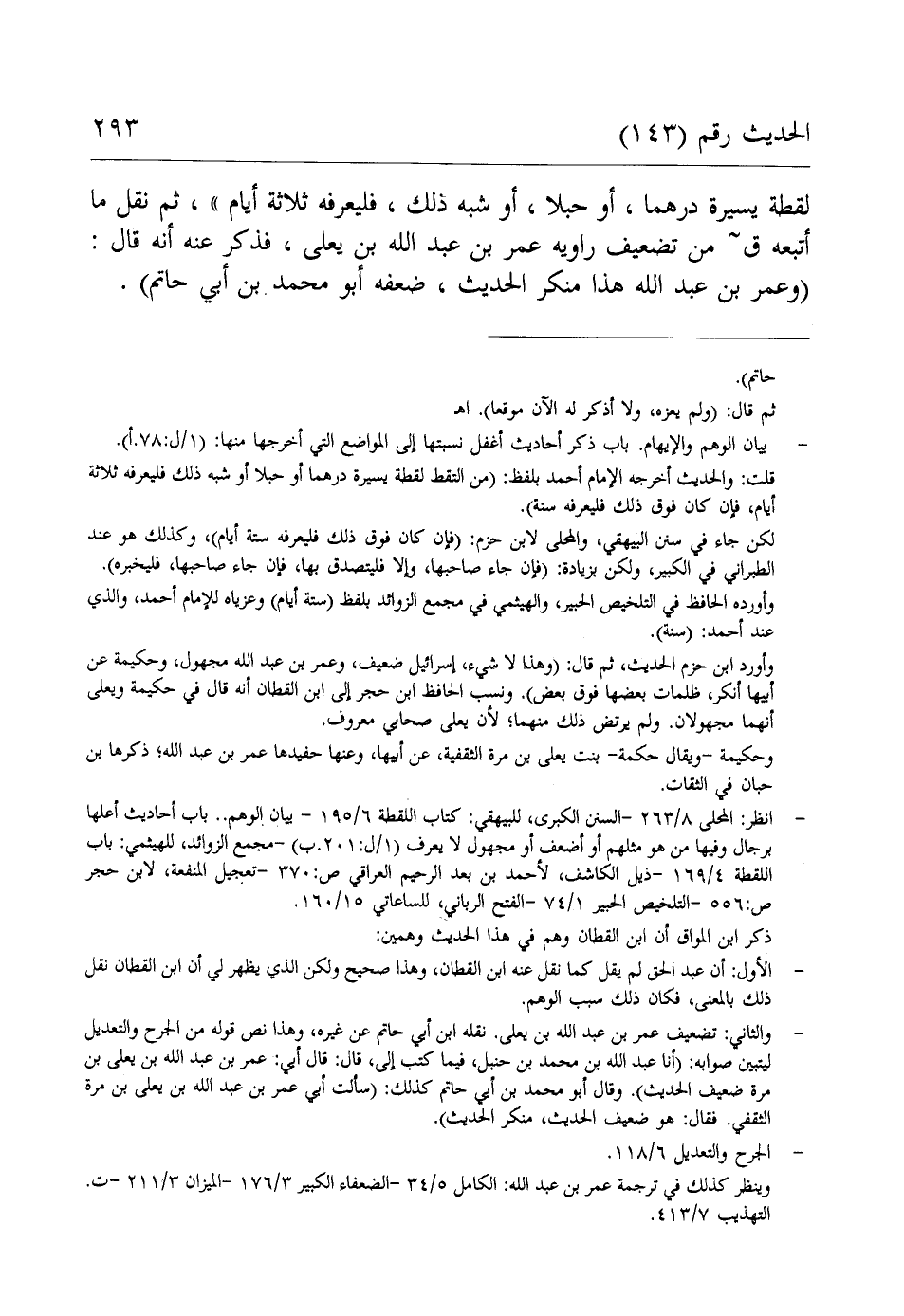 لقطة يسيرة درهما، أو حبلا، أو شبه ذلك، فليعرفه ثلاثة أيام"، ثم نقل ما أتبعه ق من تضعيف راويه عمر بن عبد الله بن يعلى، فذكر عنه أنه قال: (وعمر بن عبد الله هذا منكر الحديث، ضعفه أبو محمد بن أبي حاتم).