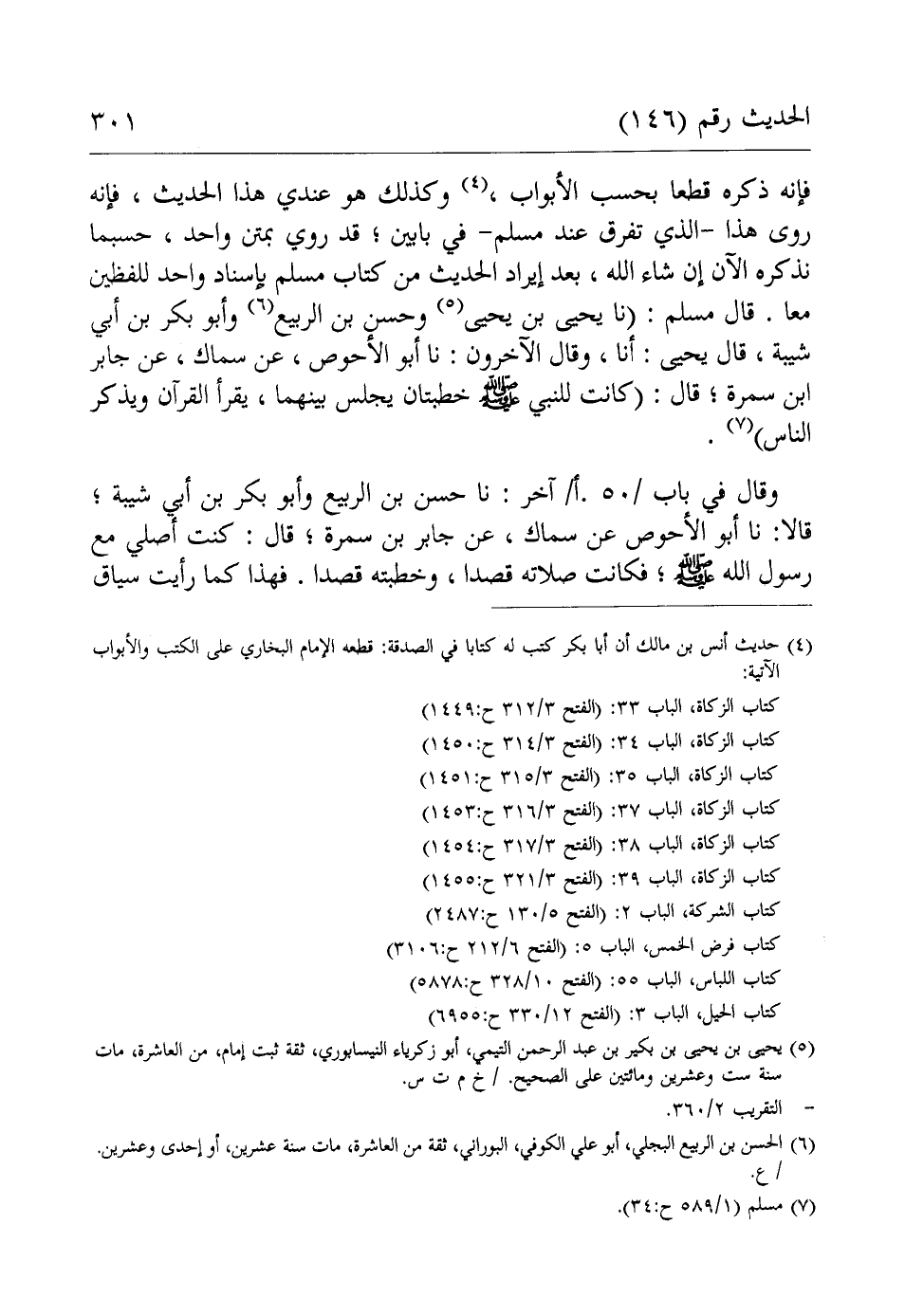 وقال في باب آخر: نا حسن بن الربيع وأبو بكر بن أبي شيبة، قالا: نا أبو الأحوص عن سماك، عن جابر بن سمرة؛ قال: كنت أصلي مع رسول الله - صلى الله عليه وسلم -، فكانت صلاته قصدا، وخطبته قصدا. فهذا كما رأيت سياق