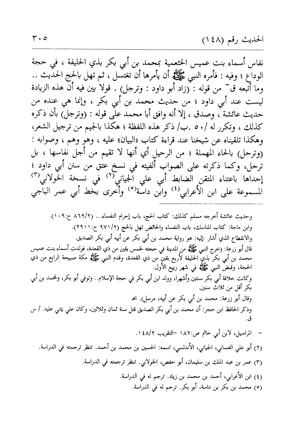 نفاس أسماء بنت عميس الخثعمية بمحمد بن أبي بكر بذي الحليفة، في حجة الوداع؛ وفيه: فأمره النبي - صلى الله عليه وسلم - أن يأمرها أن تغتسل، ثم تهل بالحج الحديث .. وما أتبعه ق من قوله: (زاد أبو داود: وترجل). قولا بين فيه أن هذه الزيادة ليست عند أبي داود، من حديث محمد بن أبي بكر، وإنما هي عنده من حديث عائشة، وصدق، إلا أنه وافق أبا محمد على قوله: (وترجل) بأن ذكره كذلك، وتكرر له ذكر هذه اللفظة؛ هكذا بالجيم من ترجيل الشعر، وهكذا تلقيناه عن شيخنا عند قراءة كتاب "البيان" عليه، وهو وهم، وصوابه: (وترحل) بالحاء المهملة، من الرحيل أي أنها لا تقيم من أجل نفاسها، بل ترحل، وكما ذكرته على الصواب ألفيته في نسخ عتق من سنن أبي داود؛ إحداها باعتناء المتقن الضابط أبي علي الجياني (¬2) في نسخة الخولاني (¬3) المسموعة على ابن الأعرابي (¬4) وابن داسة (¬5) وأخرى بخط أبي عمر الباجي