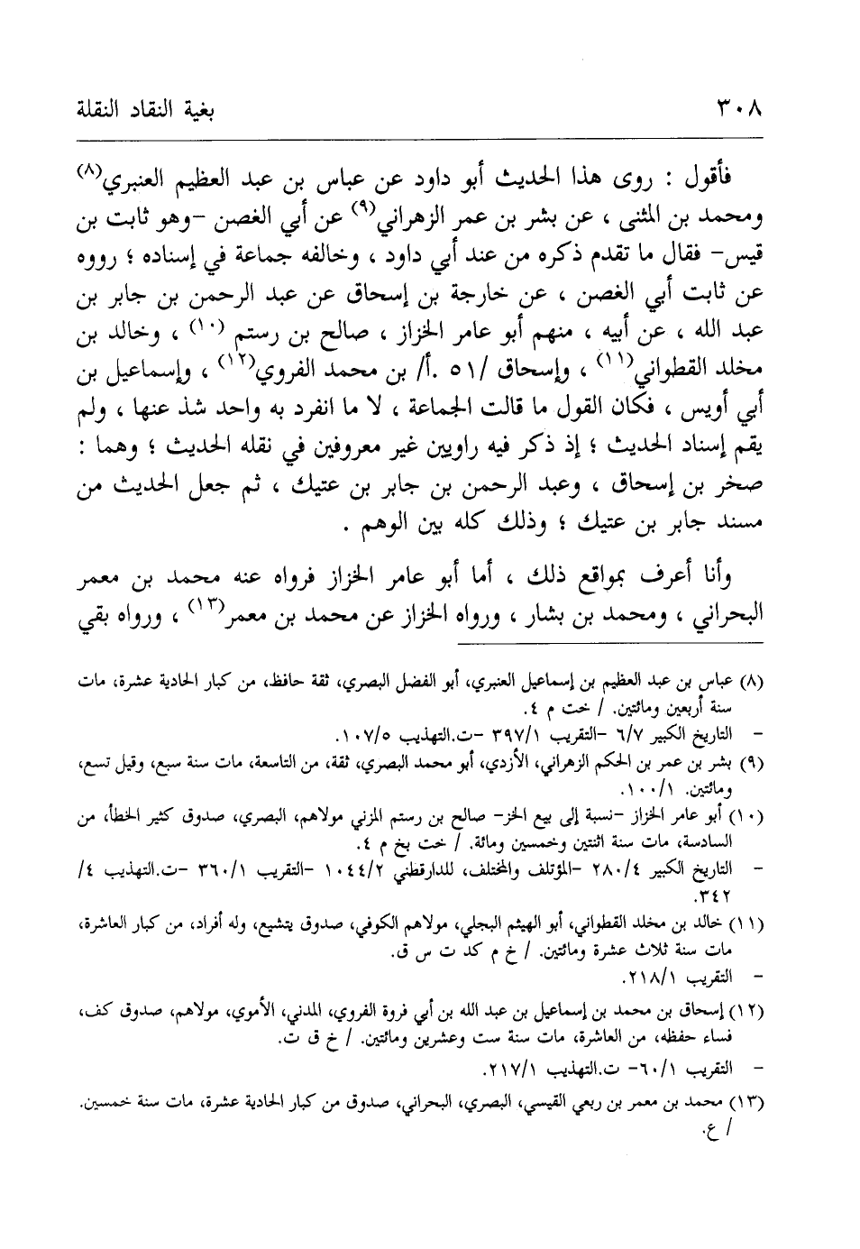 (¬9) بشر بن عمر بن الحكم الزهراني، الأزدي، أبو محمد البصري، ثقة، من التاسعة، مات سنة سبع، وقيل تسع، ومائتين. 1/ 100.