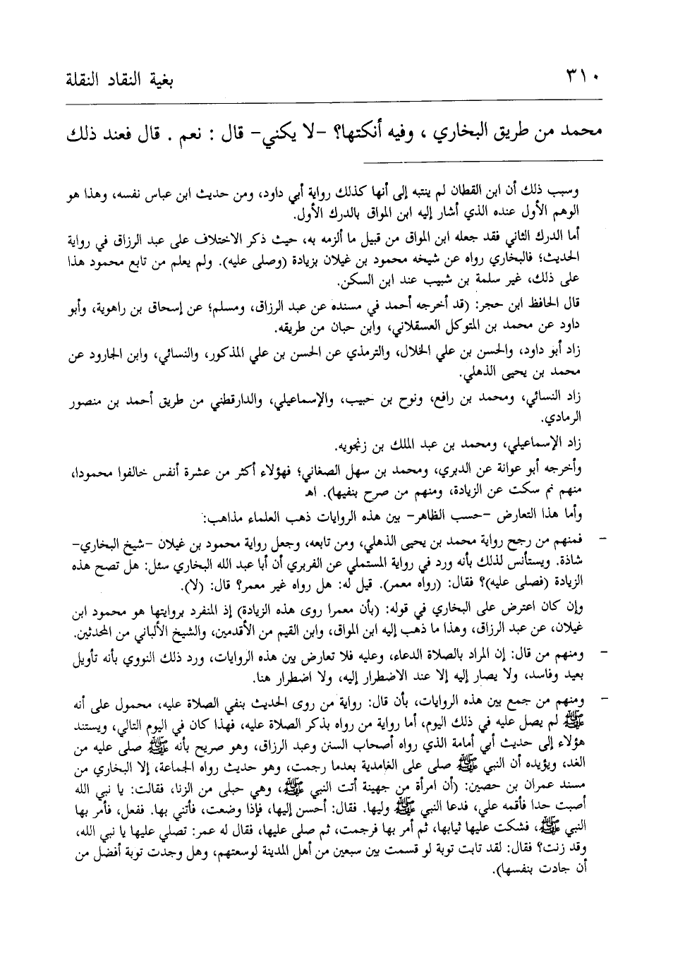 - فمنهم من رجح رواية محمد بن يحيى الذهلي، ومن تابعه، وجعل رواية محمود بن غيلان -شيخ البخاري- شاذة. ويستأنس لذلك بأنه ورد في رواية المستملي عن الفربري أن أبا عبد الله البخاري سئل: هل تصح هذه الزيادة (فصلى عليه)؟ فقال: (رواه معمر). قيل له: هل رواه غير معمر؟ قال: (لا).