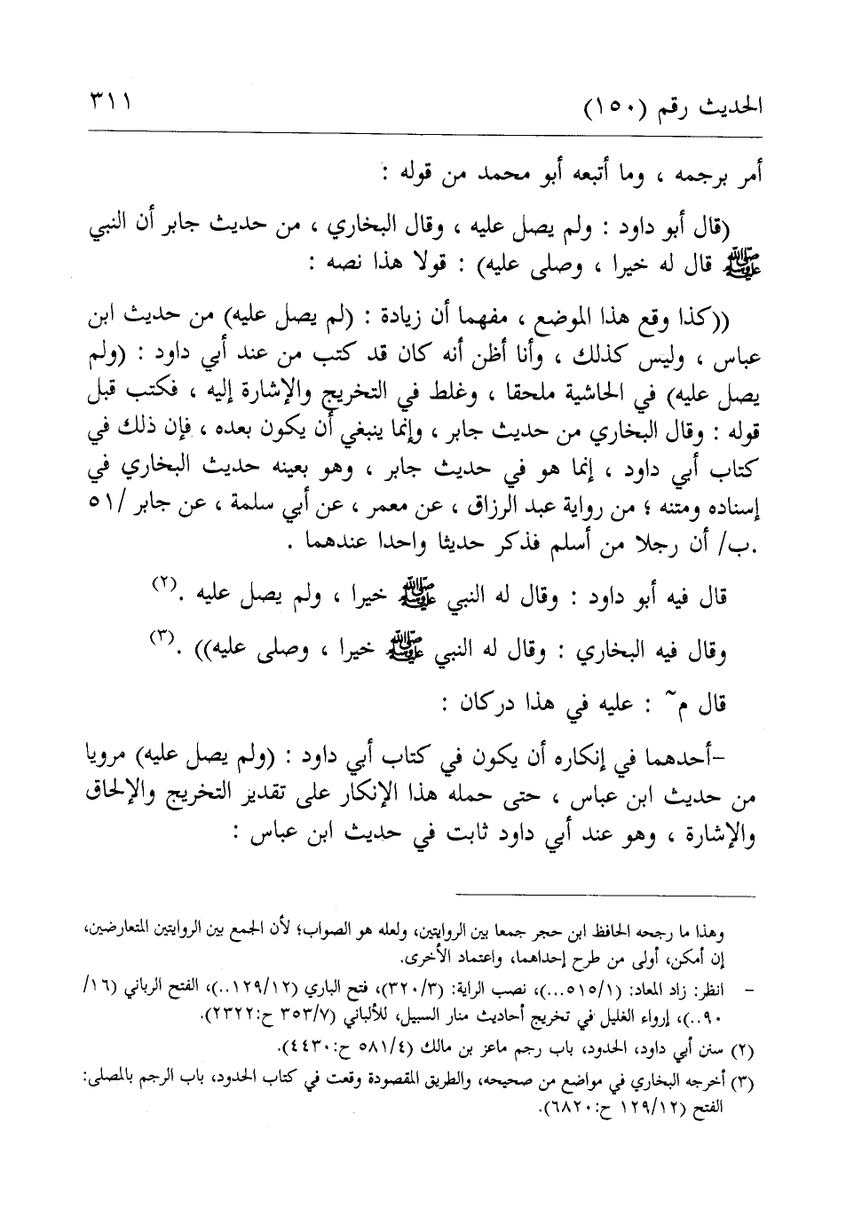 - أحدهما في إنكاره أن يكون في كتاب أبي داود: (ولم يصل عليه) مرويا من حديث ابن عباس، حتى حمله هذا الإنكار على تقدير التخريج والإلحاق والإشارة، وهو عند أبي داود ثابت في حديث ابن عباس: