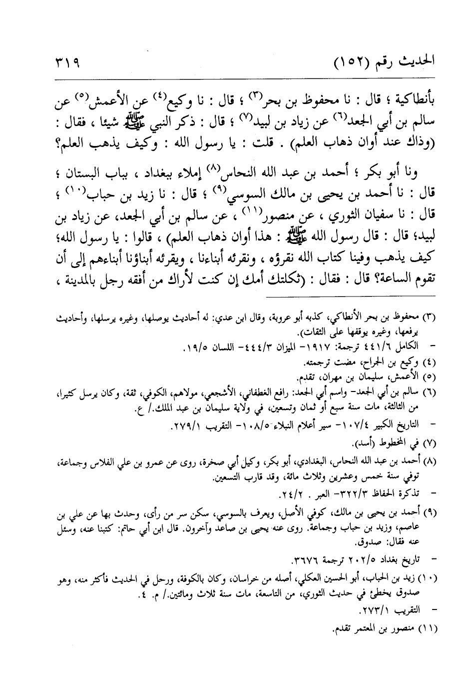 ونا أبو بكر؛ أحمد بن عبد الله النحاس (¬8) إملاء ببغداد، بباب البستان؛ قال: نا أحمد بن يحيى بن مالك السوسي (¬9)، قال: نا زيد بن حباب (¬10)؛ قال: نا سفيان الثوري، عن منصور (¬11)، عن سالم بن أبي الجعد، عن زياد بن لبيد، قال: قال رسول الله - صلى الله عليه وسلم -: هذا أوان ذهاب العلم)، قالوا: يا رسول الله، كيف يذهب وفينا كتاب الله نقرؤه، ونقرئه أبناءنا، ويقرئه أبناؤنا أبناءهم إلى أن تقوم الساعة؟ قال: فقال: (ثكلتك أمك إن كنت لأراك من أفقه رجل بالمدينة،
