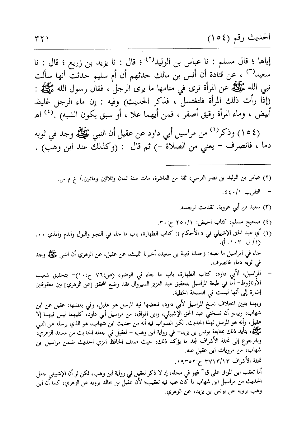 وبهذا يتبين اختلاف نسخ المراسيل لأبي داود، فبعضها فيه المرسل هو عقيل، وفي بعضها: عقيل عن ابن شهاب، ويبدو أن نسختي عبد الحق الإشبيلي، وابن المواق، من مراسيل أبي اود، كليهما ليس فيهما إلا عقيل، وأنه هو المرسل لهذا الحديث. لكن الصواب فيه أنه من حديث ابن شهاب، هو الذي رسله عن النبي - صلى الله عليه وسلم -, يتأيد ذلك بمتابعة يونس بن يزيد -في رواية ابن وهب- لعقيل في جعله الحديث من مسند الزهري، وبالرجوع إلى تحفة الأشراف نجد ما يؤكد ذلك، حيث صنف الحافظ المزي الحديث ضمن مراسيل ابن شهاب، من مرويات ابن عقيل عنه.