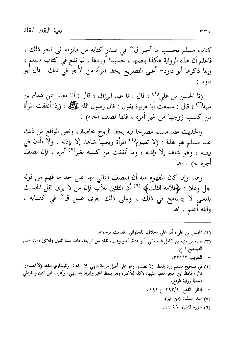 (نا الحسن بن علي (¬2)، قال: نا عبد الرزاق، قال: أنا معمر عن همام بن منبه (¬3)؛ قال: سمعت أبا هريرة يقول: قال رسول الله - صلى الله عليه وسلم -: (إذا أنفقت المرأة من كسب زوجها من غير أمره، فلها نصف أجره).