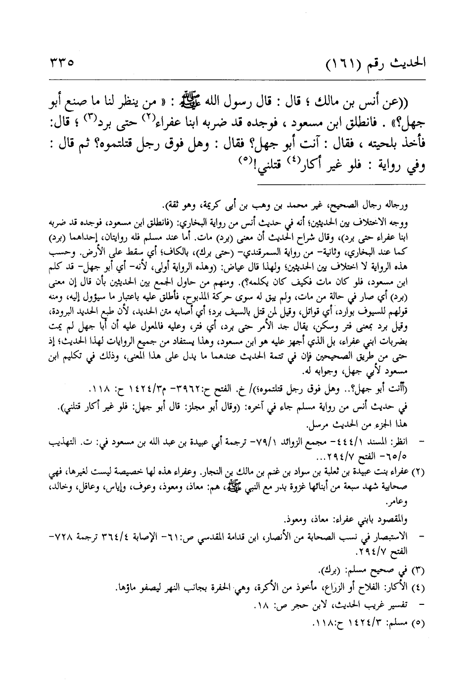 (أأنت أبو جهل؟ .. وهل فوق رجل قتلتموه؛) / خ، الفتح ح: 3962 - م 3/ 1424 ح: 118.