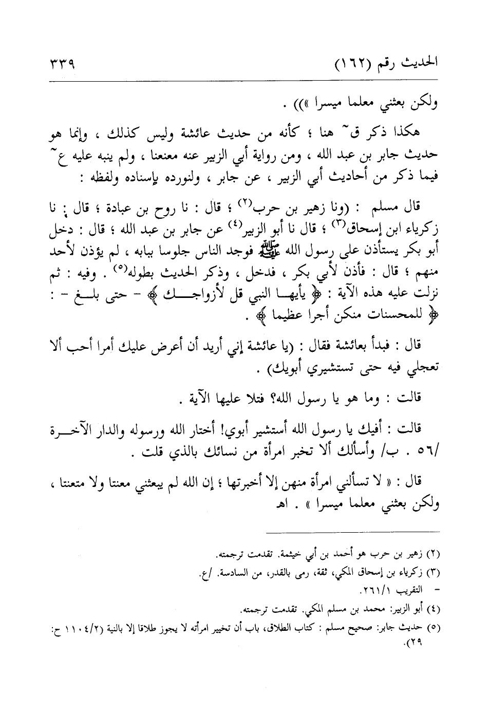 قال مسلم: (ونا زهير بن حرب (¬2)؛ قال: نا روح بن عبادة؛ قال: نا زكرياء ابن إسحاق (¬3)، قال نا أبو الزبير (¬4) عن جابر بن عبد الله؛ قال: دخل أبو بكر يستأذن على رسول الله - صلى الله عليه وسلم - فوجد الناس جلوسا ببابه، لم يؤذن لأحد منهم؛ قال: فأذن لأبي بكر، فدخل، وذكر الحديث بطوله (¬5). وفيه: ثم نزلت عليه هذه الآية: {يَاأَيُّهَا النَّبِيُّ قُلْ لِأَزْوَاجِكَ} - حتى بلغ -: {لِلْمُحْسِنَاتِ مِنْكُنَّ أَجْرًا عَظِيمًا}.