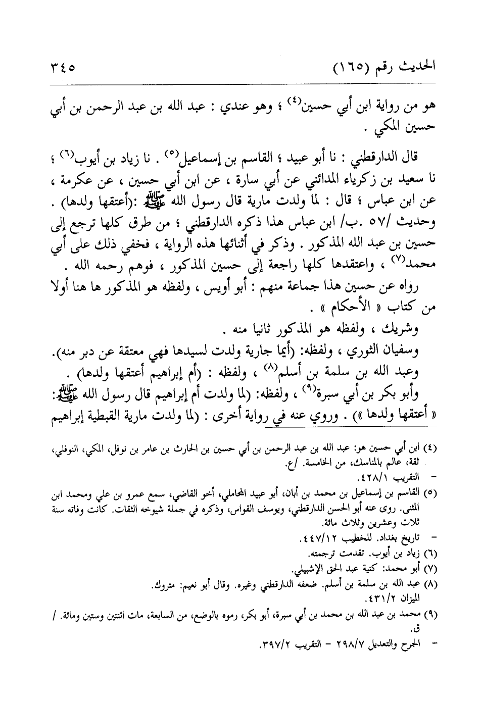 قال الدارقطني: نا أبو عبيد؛ القاسم بن إسماعيل (¬5). نا زياد بن أيوب (¬6)؛ نا سعيد بن زكرياء المدائني عن أبي سارة، عن ابن أبي حسين، عن عكرمة، عن ابن عباس؛ قال: لما ولدت مارية قال رسول الله - صلى الله عليه وسلم -: (أعتقها ولدها). وحديث ابن عباس هذا ذكره الدارقطني؛ من طرق كلها ترجع إلى حسين بن عبد الله المذكور. وذكر في أثنائها هذه الرواية، فخفي ذلك على أبي محمد (¬7)، واعتقدها كلها راجعة إلى حسين المذكور، فوهم -رَحِمَهُ اللهُ-.