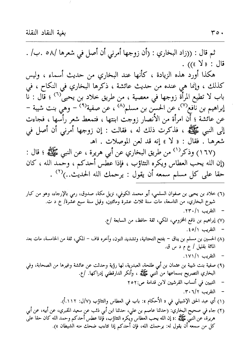هكذا أورد هذه الزيادة، كأنها عند البخاري من حديث أسماء، وليس كذلك، وإنما هي عنده من حديث عائشة، ذكرها البخاري في النكاح، في باب لا تطيع المرأة زوجها في معصية، من طريق خلاد بن يحيى (¬6)؛ قال: نا إبراهيم بن نافع (¬7)، عن الحسن بن مسلم (¬8)، عن صفية (¬9) -وهي بنت شيبة- عن عائشة؛ أن امرأة من الأنصار زوجت ابنتها، فتمعط شعر رأسها، فجاءت إلى النبي - صلى الله عليه وسلم -، فذكرت ذلك له، فقالت: إن زوجها أمرنى أن أصل في شعرها. فقال: "لا" إنه قد لعن الموصلات. اهـ