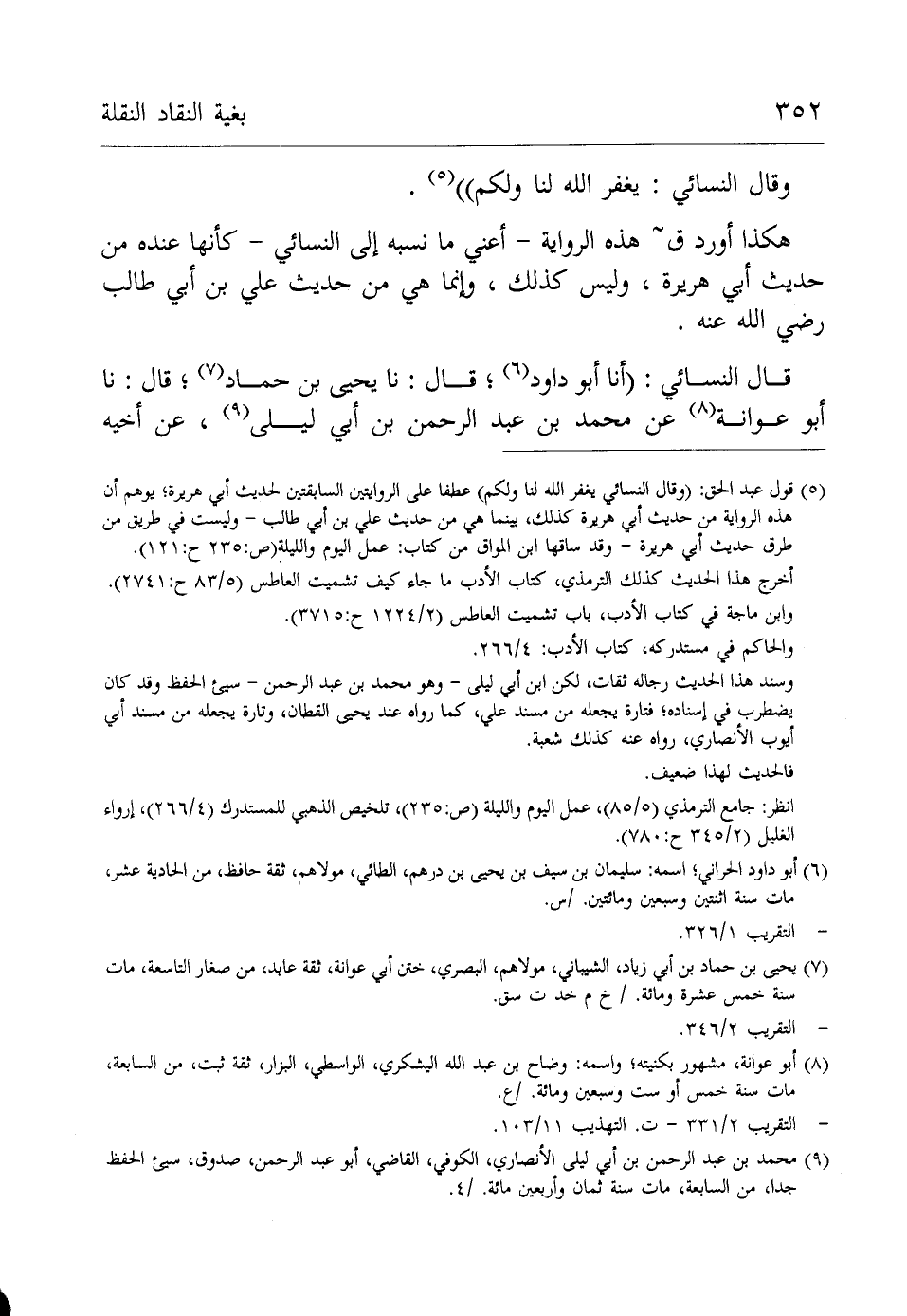 (¬5) قول عبد الحق: (وقال النسائي يغفر الله لنا ولكم) عطفا على الروايتين السابقتين لحديث أبي هريرة؛ يوهم أن هذه الرواية من حديث أبي هريرة كذلك، بينما هي من حديث علي بن أبي طالب -وليست في طريق من طرق حديث أبي هريرة- وقد ساقها ابن المواق من كتاب: عمل اليوم والليلة (ص: 235 ح: 121).