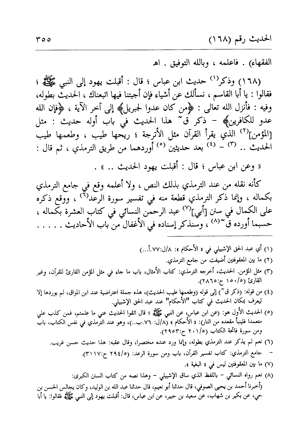 (168) وذكر (¬1) حديث ابن عباس، قال: أقبلت يهود إلى النبي - صلى الله عليه وسلم - فقالوا: يا أبا القاسم، نسألك عن أشياء فإن أجبتنا فيها اتبعناك، الحديث بطوله، وفيه: فأنزل الله تعالى: {قُلْ مَنْ كَانَ عَدُوًّا لِجِبْرِيلَ} إلى آخر الآية، {فَإِنَّ اللَّهَ عَدُوٌّ لِلْكَافِرِينَ} - ذكر ق هذا الحديث في باب أوله حديث: مثل [المؤمن] (¬2) الذي يقرأ القرآن مثل الأترجة، ريحها طيب، وطعمها طيب الحديث .. (¬3) - (¬4) بعد حديثين (¬5) أوردهما من طريق الترمذي، ثم قال: