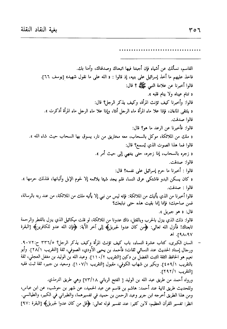 - السنن الكبرى، كتاب عشرة النساء، باب كيف تؤنث المرأة وكيف يذكر الرجل؟ 5/ 336 ح: 9072. ورجال إسناد الحديث عند النسائي ثقات؛ فأحمد بن يحيى الأودي، الصوفي، ثقة [التقريب 1/ 28]. وأبو نعيم هو الحافظ الثقة الثبت الفضل بن دكين [التقريب 2/ 110]. وعبد الله بن الوليد بن مغفل العجلي، ثقة بالتقرب 1/ 459]. وبكير بن شهاب الكوفي، مقبول [التقريب 1/ 107]. وسعيد بن جبير، ثقة ثبت فقيه [التقريب 1/ 292].