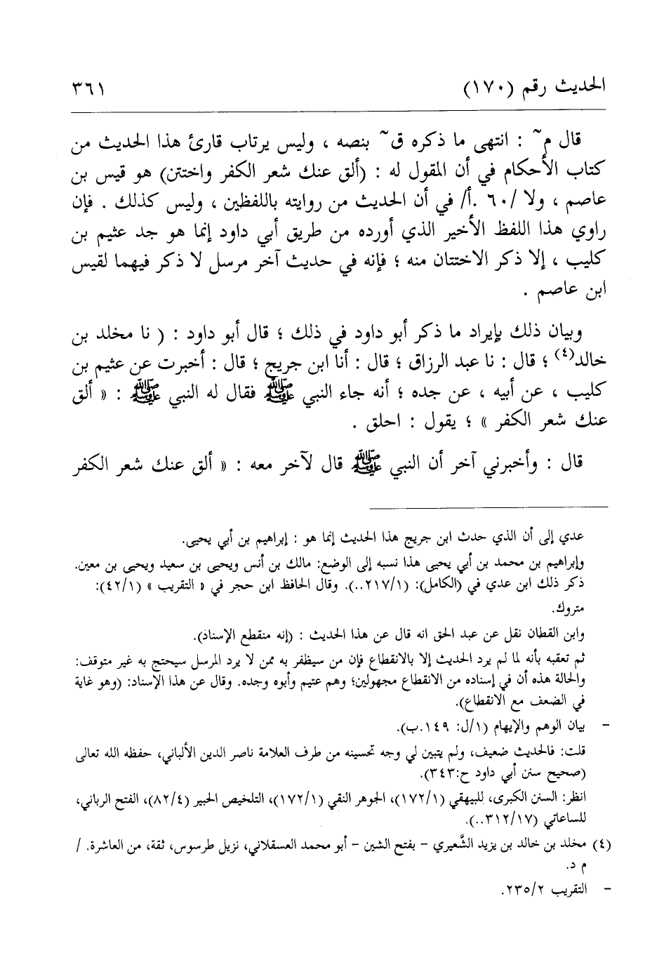 قال م: انتهى ما ذكره ق بنصه، وليس يرتاب قارئ هذا الحديث من كتاب الأحكام في أن المقول له: (ألق عنك شعر الكفر واختتن) هو قيس بن عاصم، ولا في أن الحديث من روايته باللفظين، وليس كذلك. فإن راوي هذا اللفظ الأخير الذي أورده من طريق أبي داود إنما هو جد عثيم بن كليب، إلا ذكر الاختتان منه، فإنه في حديث آخر مرسل لا ذكر فيهما لقيس ابن عاصم.