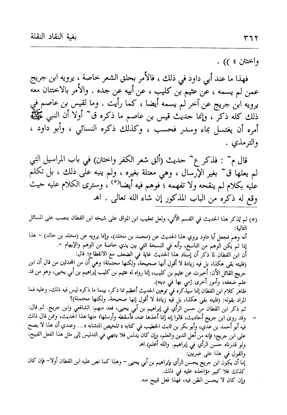 فهذا ما عند أبي داود في ذلك، فالأمر بحلق الشعر خاصة، يرويه ابن جريج عمن لم يسمه، عن عثيم بن كليب، عن أبيه عن جده. والأمر بالإختتان معه يرويه ابن جريج عن آخر لم يسمه أيضًا، كما رأيت. وما لقيس بن عاصم فى ذلك كله ذكر، وإنما حديث قيس بن عاصم ما ذكره ق أولا أن النبي - صلى الله عليه وسلم - أمره أن يغتسل بماء وسدر فحسب، وكذلك ذكره النسائي، وأبو داود، والترمذي.