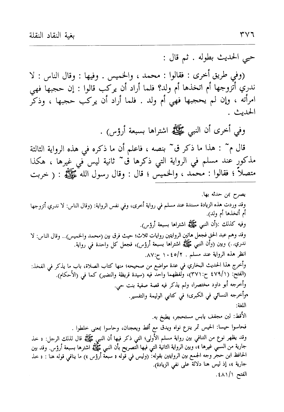 وقد وهم عبد الحق فجعل هاتين الروايتين روايات ثلاث؛ حيث فرق بين (محمد والخميس) .. وقال الناس: لا ندري ..) وبين (وأن النبي - صلى الله عليه وسلم - اشتراها بسبعة أرؤس)، فجعل كل واحدة في رواية.