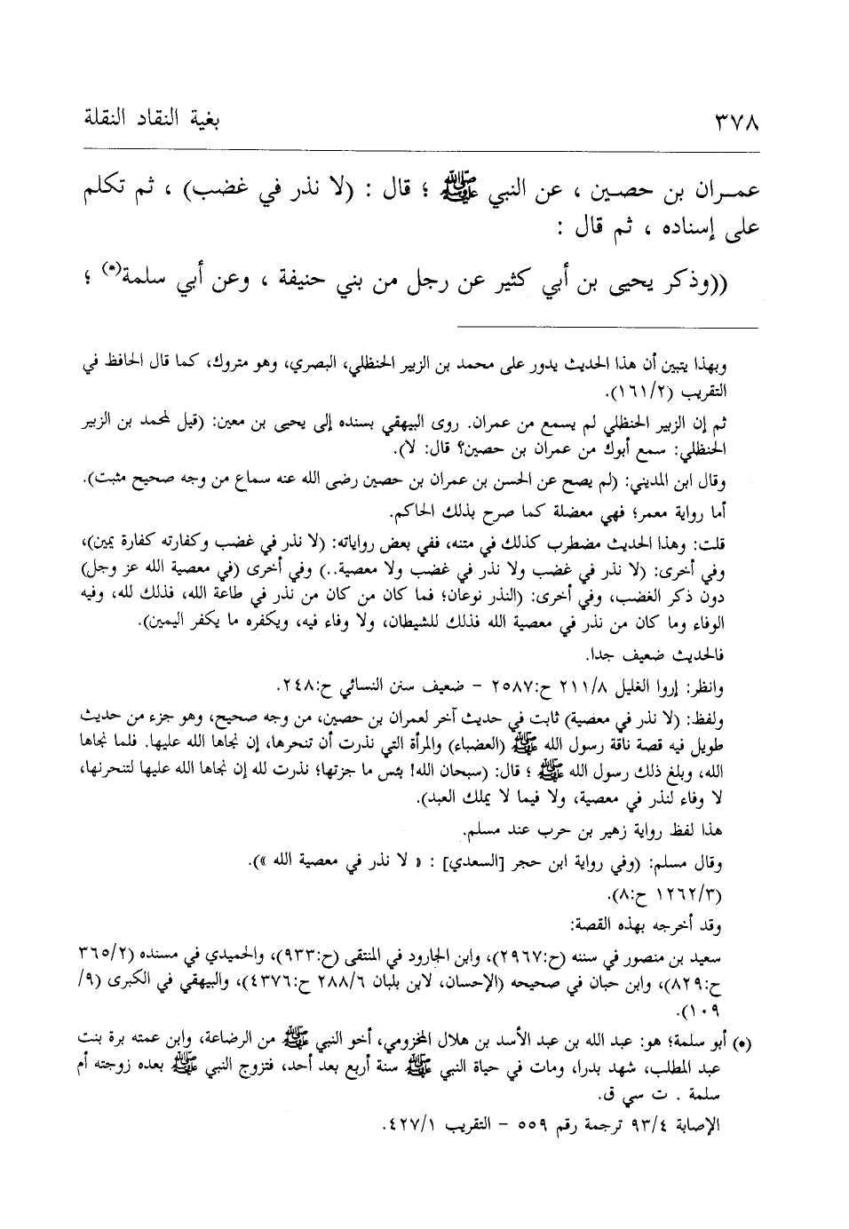 قلت: وهذا الحديث مضطرب كذلك في متنه، ففي بعض رواياته: (لا نذر في غضب وكفارته كفارة يمين)، وفي أخرى: (لا نذر في غضب ولا نذر في غضب ولا معصية ..) وفي أخرى (في معصية الله -عَزَّ وَجَلَّ-) دون ذكر الغضب، وفي أخرى: (النذر نوعان؛ فما كان من كان من نذر في طاعة الله، فذلك لله، وفيه الوفاء وما كان من نذر في معصية الله فذلك للشيطان، ولا وفاء فيه، ويكفره ما يكفر اليمين).