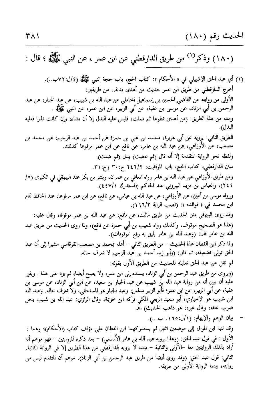 (¬1) أي عبد الحق الإشبيلي في "الأحكام": كتاب الحج، باب حجة النبي - صلى الله عليه وسلم - (4 / ل: 72 ب ..).