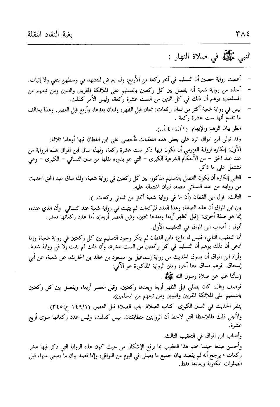 أما التعقيب الثاني، فليس له داع؛ فابن القطان لم ينكر وجود التسليم بين كل ركعتين في رواية شعبة؛ وإنما ادعى أن ذلك يوهم أن التسليم في كل ركعتين من الست عشرة، وأن ذلك لم يثبت إلا في رواية شعبة.