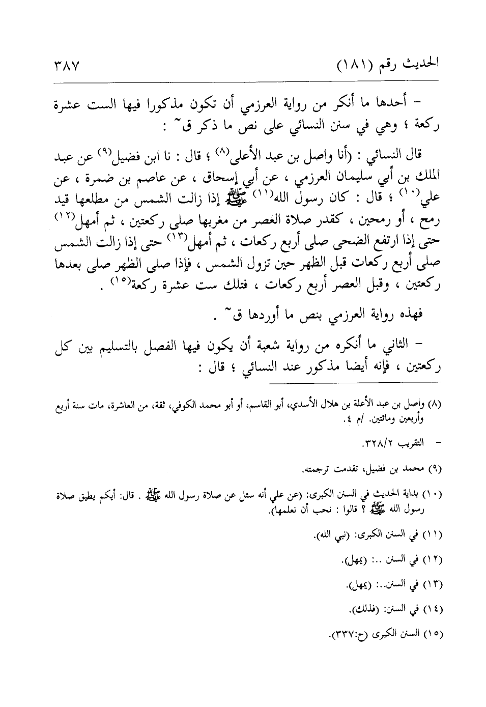 (¬10) بداية الحديث في السنن الكبرى: (عن علي أنه سئل عن صلاة رسول الله - صلى الله عليه وسلم -. قال: أيكم يطيق صلاة رسول الله - صلى الله عليه وسلم -؟ قالوا: نحب أن نعلمها).