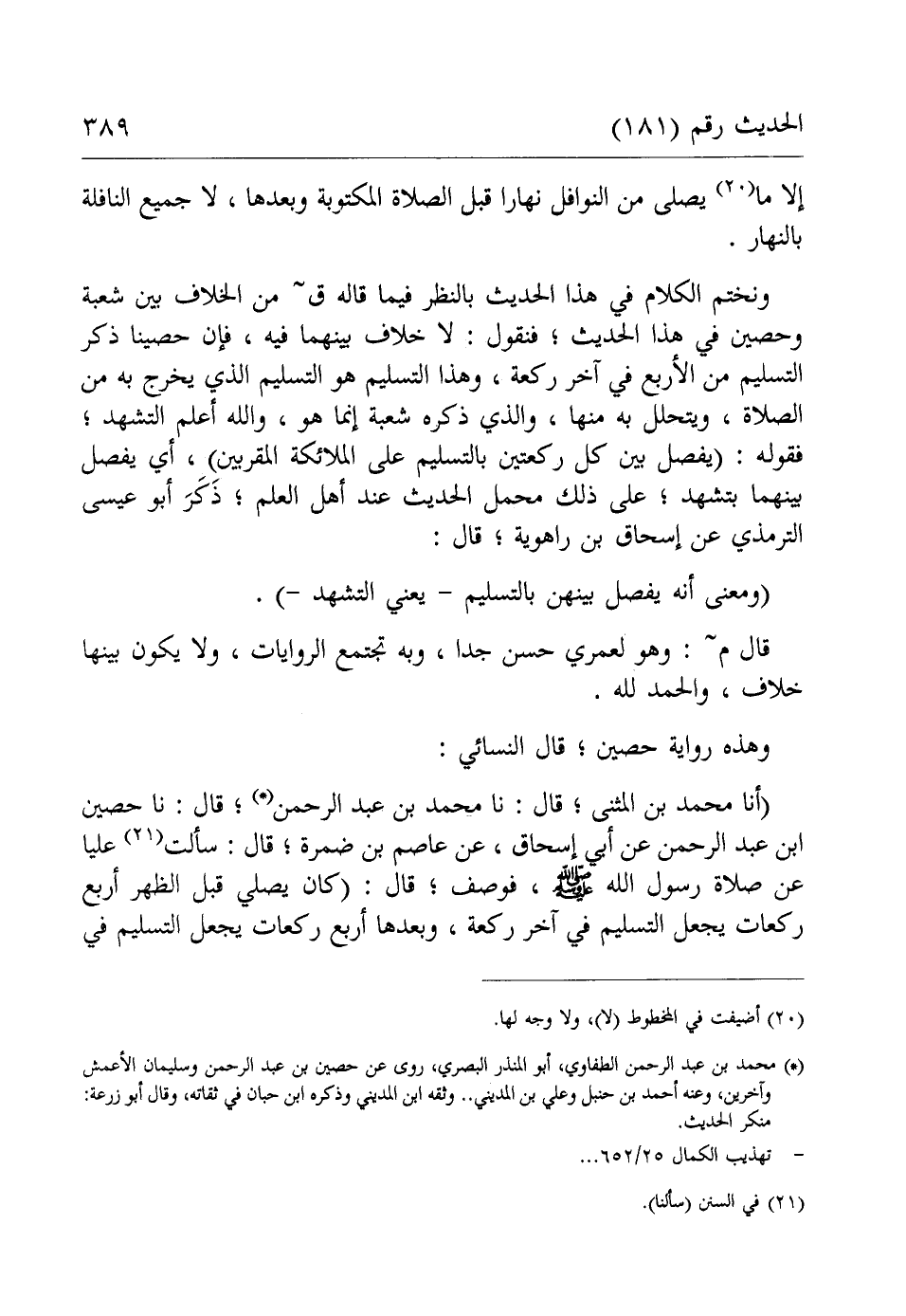 (أنا محمد بن المثنى؛ قال: نا محمد بن عبد الرحمن (*)؛ قال: نا حصين ابن عبد الرحمن عن أبي إسحاق، عن عاصم بن ضمرة؛ قال: سألت (¬21) عليا عن صلاة رسول الله - صلى الله عليه وسلم -، فوصف؛ قال: (كان يصلي قبل الظهر أربع ركعات يجعل التسليم في آخر ركعة، وبعدها أربع ركعات يجعل التسليم في