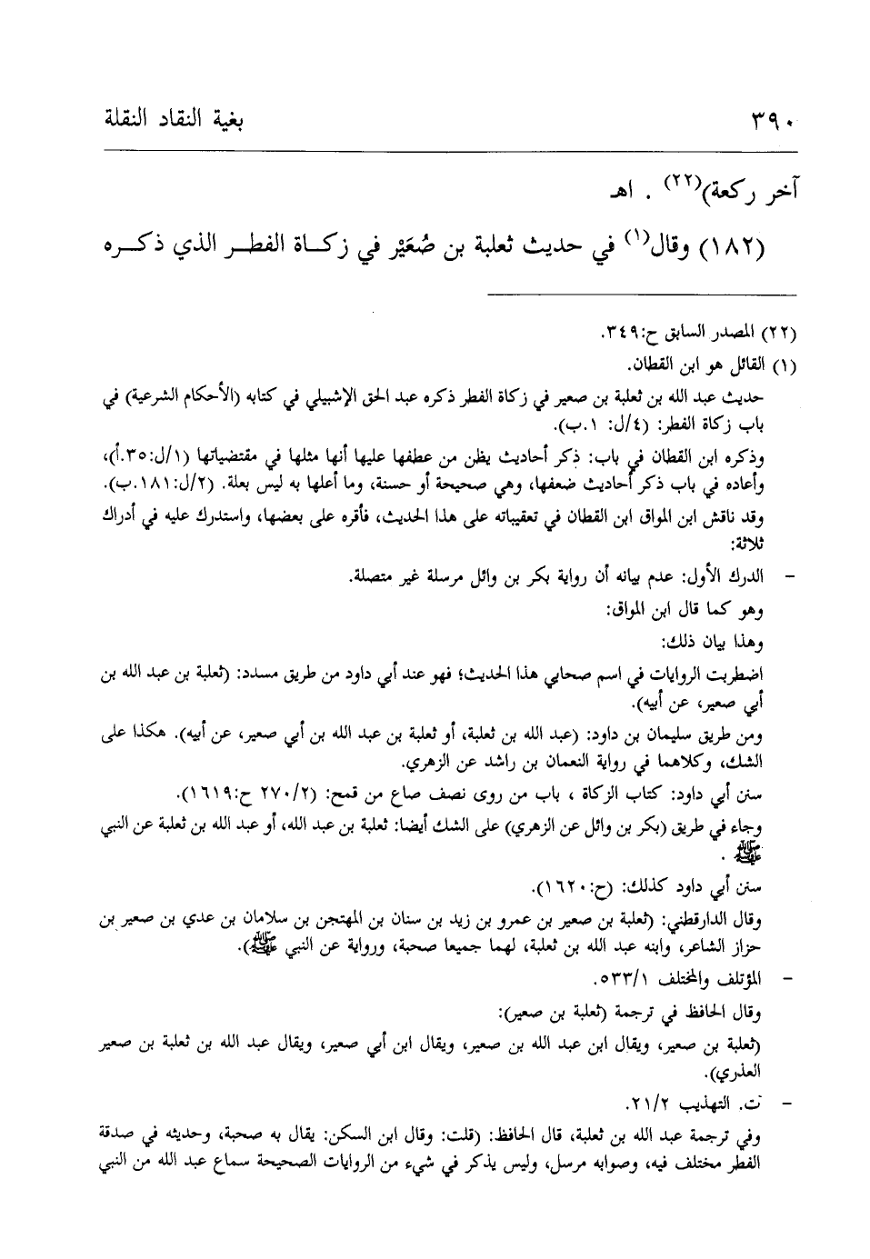 حديث عبد الله بن ثعلبة بن صعير في زكاة الفطر ذكره عبد الحق الإشبيلي في كتابه (الأحكام الشرعية) في باب زكاة الفطر: (4/ ل: 1. ب).