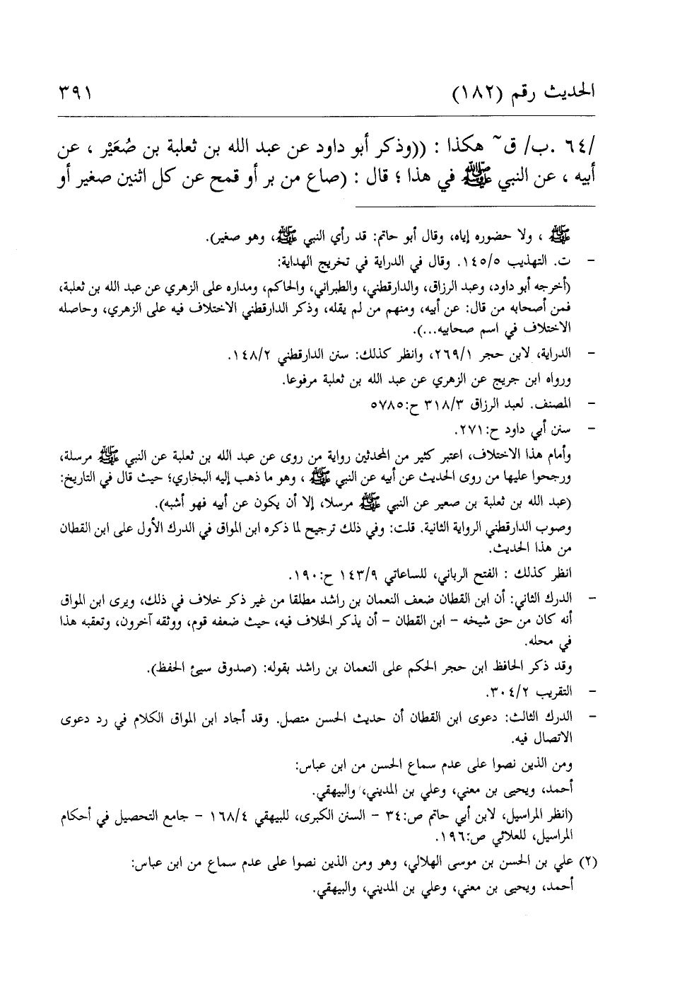 (أخرجه أبو داود، وعبد الرزاق، والدارقطني، والطبراني، والحاكم، ومداره على الزهري عن عبد الله بن ثعلبة، فمن أصحابه من قال: عن أبيه، ومنهم من لم يقله، وذكر الدارقطني الاختلاف فيه على الزهري، وحاصله الاختلاف في اسم صحابيه ...).
