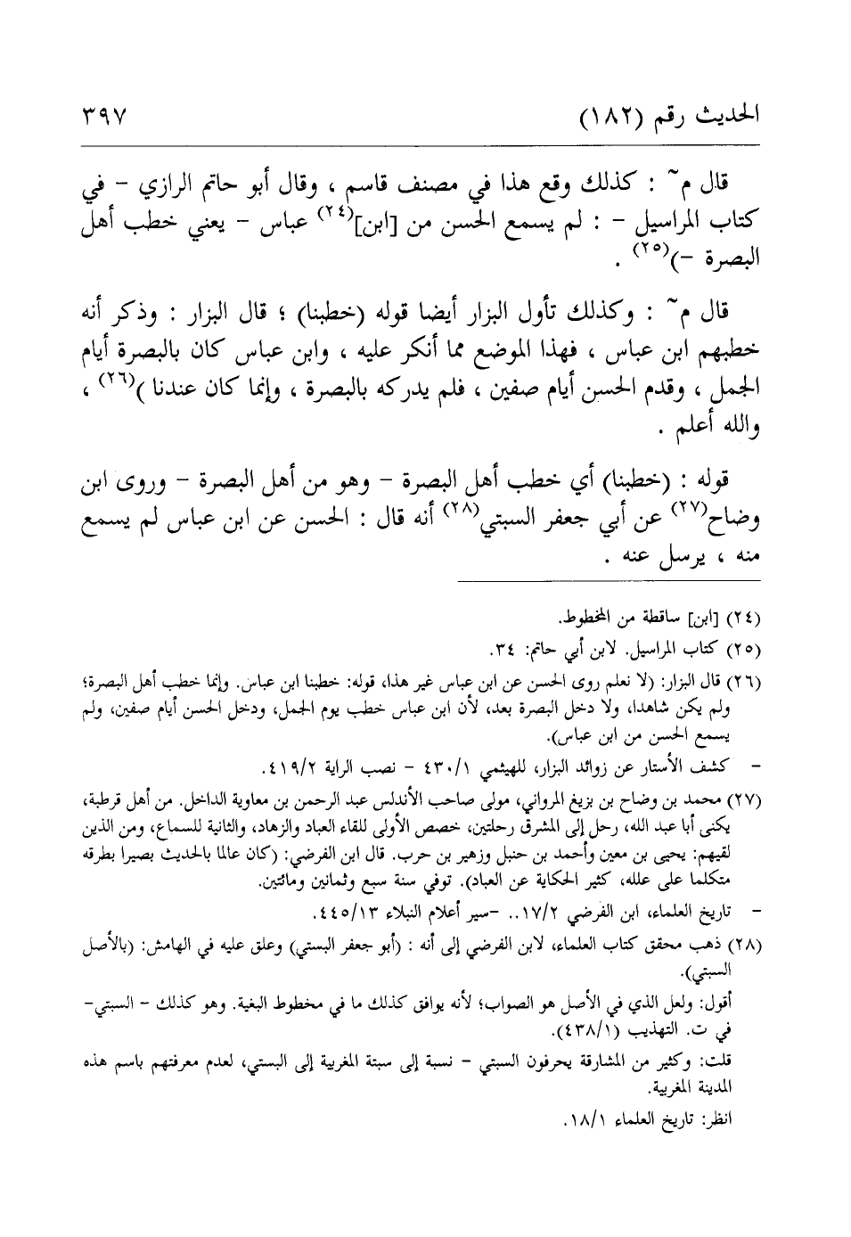 (¬26) قال البزار: (لا نعلم روى الحسن عن ابن عباس غير هذا، قوله: خطبنا ابن عباس. وإنما خطب أهل البصرة؛ ولم كن شاهدا، ولا دخل البصرة بعد، لأن ابن عباس خطب يوم الجمل، ودخل الحسن أيام صفين، ولم يسمع الحسن من ابن عباس).