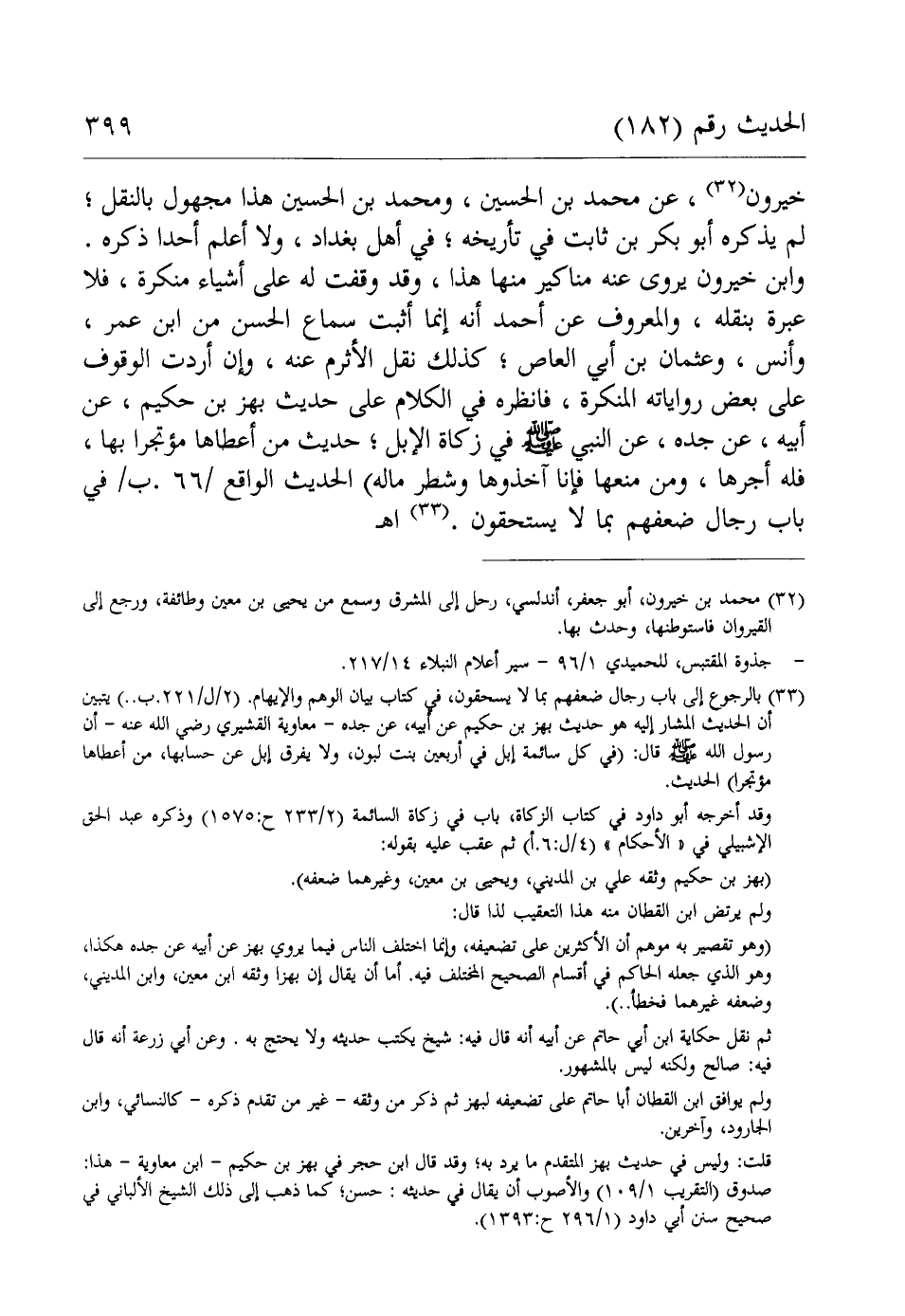 (¬33) بالرجوع إلى كتاب رجال ضعفهم بما لا يسحقون، في كتاب بيان الوهم والإيهام. (2 / ل / 221. ب ..) يتبين أن الحديث المشار إليه هو حديث بهز بن حكيم عن أبيه، عن جده - معاوية: القشيري - رضي الله عنه - أن رسول الله - صلى الله عليه وسلم - قال: (في كل سائمة إبل في أربعين بنت لبون، ولا يفرق إبل عن حسابها، من أعطاها مؤتجرًا) الحديث.