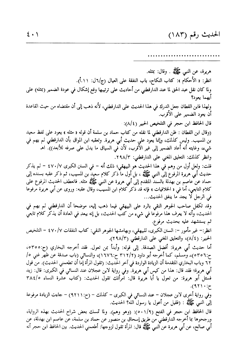 (وقال ابن القطان: ظن الدارقطني لما نقله من كتاب حماد بن سلمة أن قوله "مثله" يعود على لفظ سعيد بن المسيب. وليس كذلك، وإنما يعود على حديث أبي هريرة. وتعقبه ابن المراق بأن الدارقطني لم يهم في شيء، وغايته أنه أعاد الضمير إلى غير الأقرب، لأن في السياق ما يدل على صرفه للأبعد"".اهـ