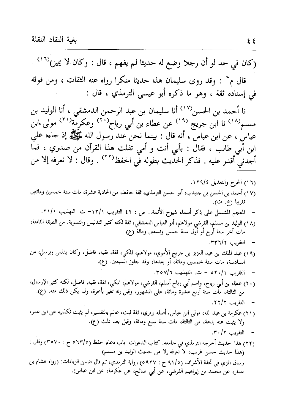 نا أحمد بن الحسن (¬17) أنا سليمان بن عبد الرحمن الدمشقي، أنا الوليد بن مسلم (¬18) نا ابن جريج (¬19) عن عطاء بن أبي رباح (¬20) وعكرمة (¬21) مولى ابن عباس، عن ابن عباس، أنه قال: بينما نحن عند رسول الله - صلى الله عليه وسلم - إذ جاءه علي ابن أبي طالب، فقال: بأبي أنت وأمي تفلت هذا القرآن من صدري، فما أجدني أقدر عليه. فذكر الحديث بطوله في الحفظ (¬22). وقال: لا نعرفه إلا من