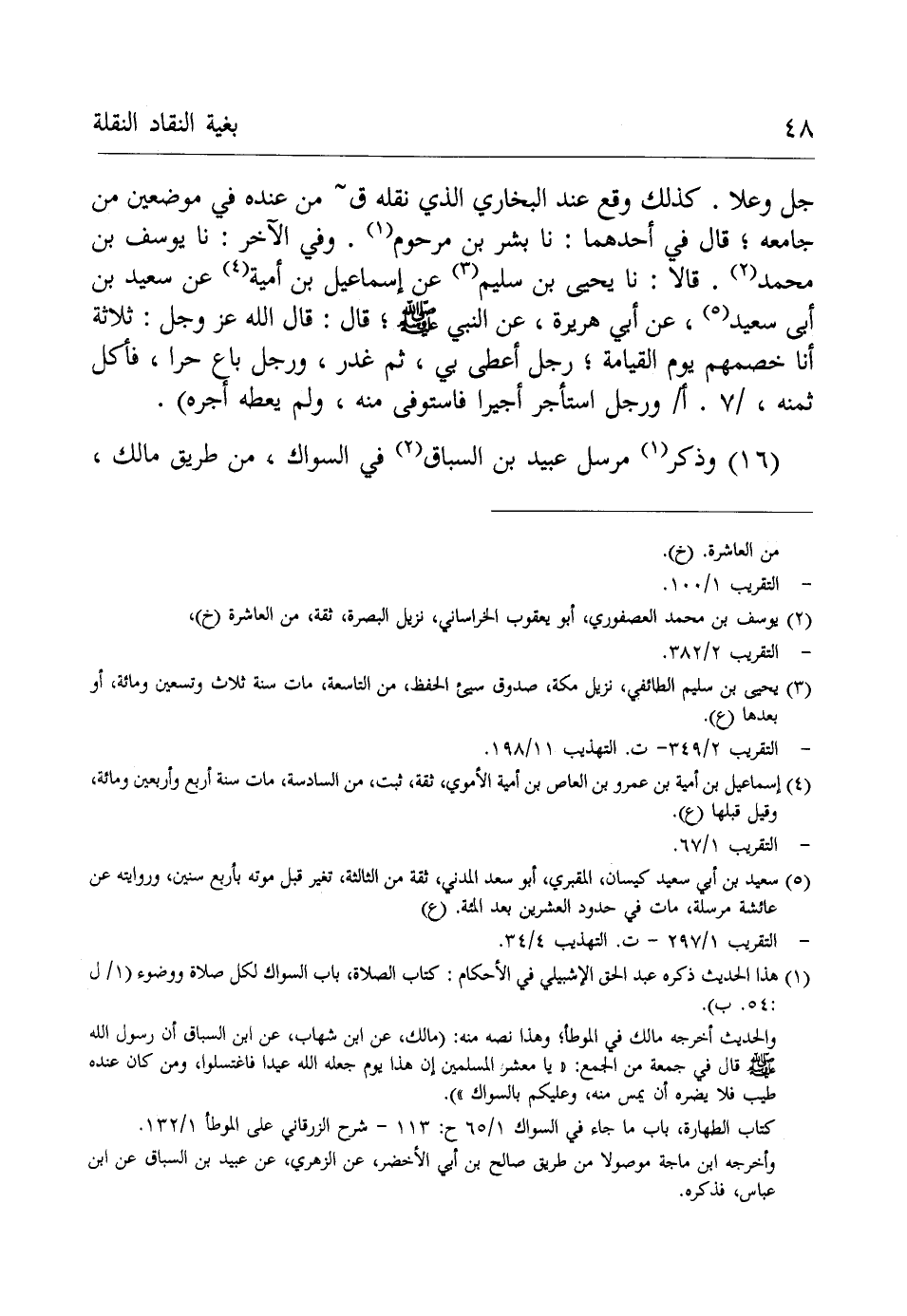 جل وعلا. كذلك وقع عند البخاري الذي نقله ق من عنده في موضعين من جامعه؛ قال في أحدهما: نا بشر بن مرحوم (¬1). وفي الآخر: نا يوسف بن محمد (¬2). قالا: نا يحيى بن سليم (¬3) في إسماعيل بن أمية (¬4) عن سعيد بن أبي سعيد (¬5)، عن أبي هريرة، عن النبي - صلى الله عليه وسلم -؛ قال: قال الله -عَزَّ وَجَلَّ-: ثلاثة أنا خصمهم يوم القيامة؛ رجل أعطى لي، ثم غدر، ورجل باع حرا، فأكل ثمنه،/7. أ/ ورجل استأجر أجيرا فاستوفى منه، ولم يعطه أجره).