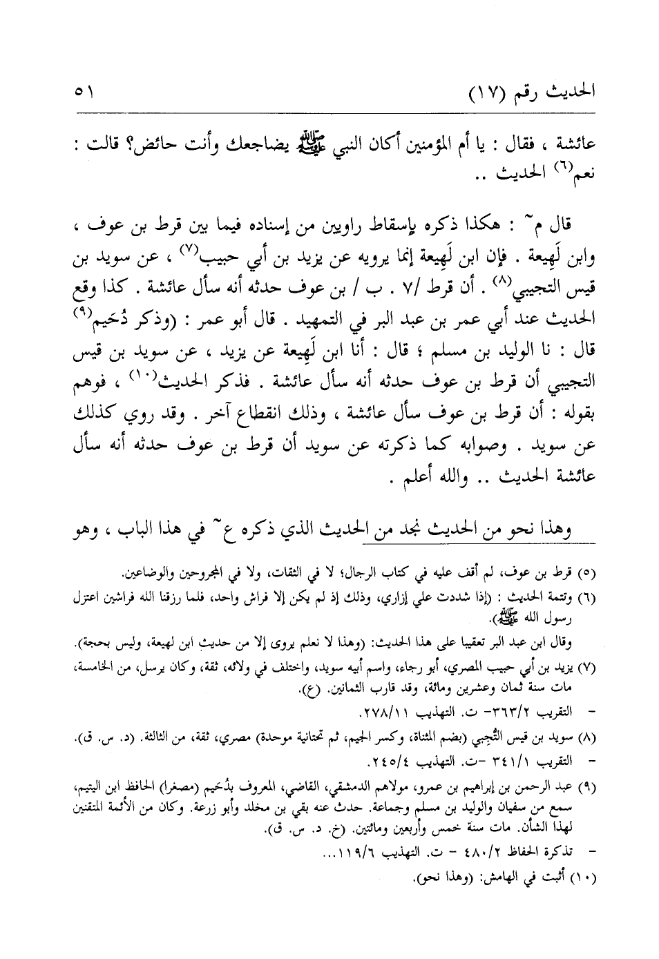 قال م: هكذا ذكره بإسقاط راويين من إسناده فيما بين قرط بن عوف، وابن لَهِيعة. فإن ابن لَهِيعة إنما يرويه عن يزيد بن أبي حبيب (¬7)، عن سويد بن قيس التجيبي (¬8). أن قرط / 7. ب/ بن عوف حدثه أنه سأل عائشة. كذا وقع الحديث عند أبي عمر بن عبد البر في التمهيد. قال أبو عمر: (وذكر دُحَيم (¬9) قال: نا الوليد بن مسلم؛ قال: أنا ابن لَهِيعة عن يزيد، عن سويد بن قيس التجيبي أن قرط بن عوف حدثه أنه سأل عائشة. فذكر الحديث (¬10)، فوهم بقوله: أن قرط بن عوف سأل عائشة، وذلك انقطاع آخر. وقد روي كذلك عن سويد. وصوابه كما ذكرته عن سويد أن قرط بن عوف حدثه أنه سأل عائشة الحديث .. والله أعلم.