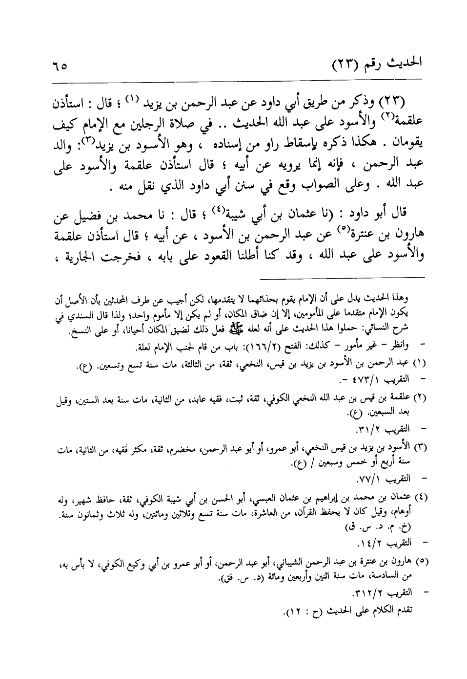 (23) وذكر من طريق أبي داود عن عبد الرحمن بن يزيد (¬1)؛ قال: استأذن علقمة (¬2) والأسود على عبد الله الحديث .. في صلاة الرجلين مع الإمام كيف يقومان. هكذا ذكره بإسقاط راو من إسناده، وهو الأسود بن يزيد (¬3): والد عبد الرحمن، فإنه إنما يرويه عن أبيه؛ قال استأذن علقمة والأسود على عبد الله. وعلى الصواب وقع في سنن أبي داود الذي نقل منه.